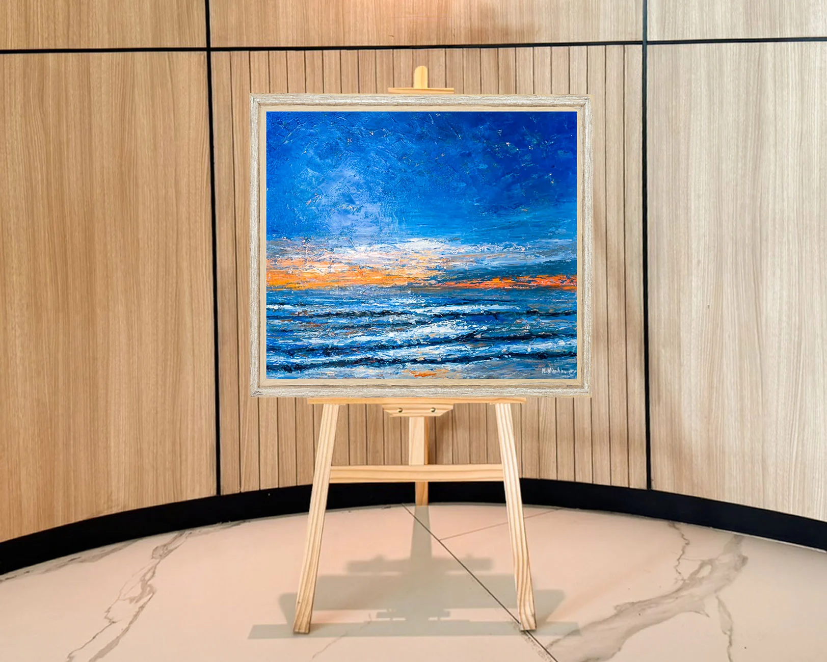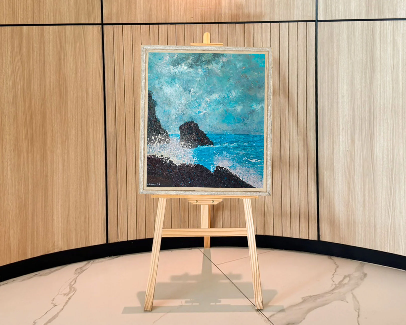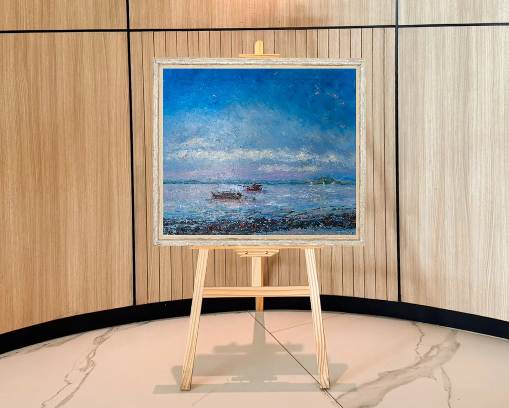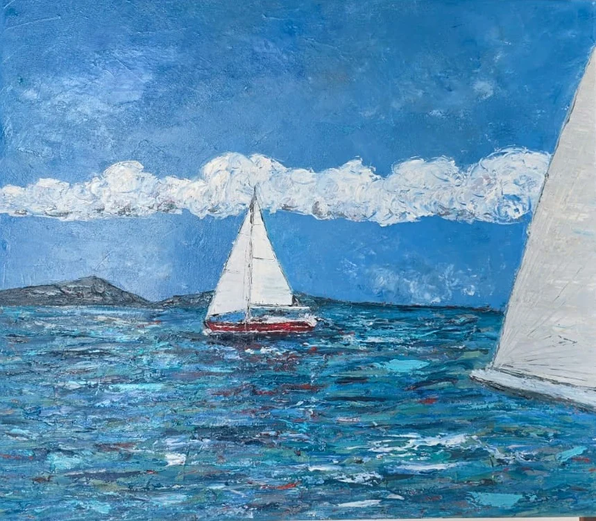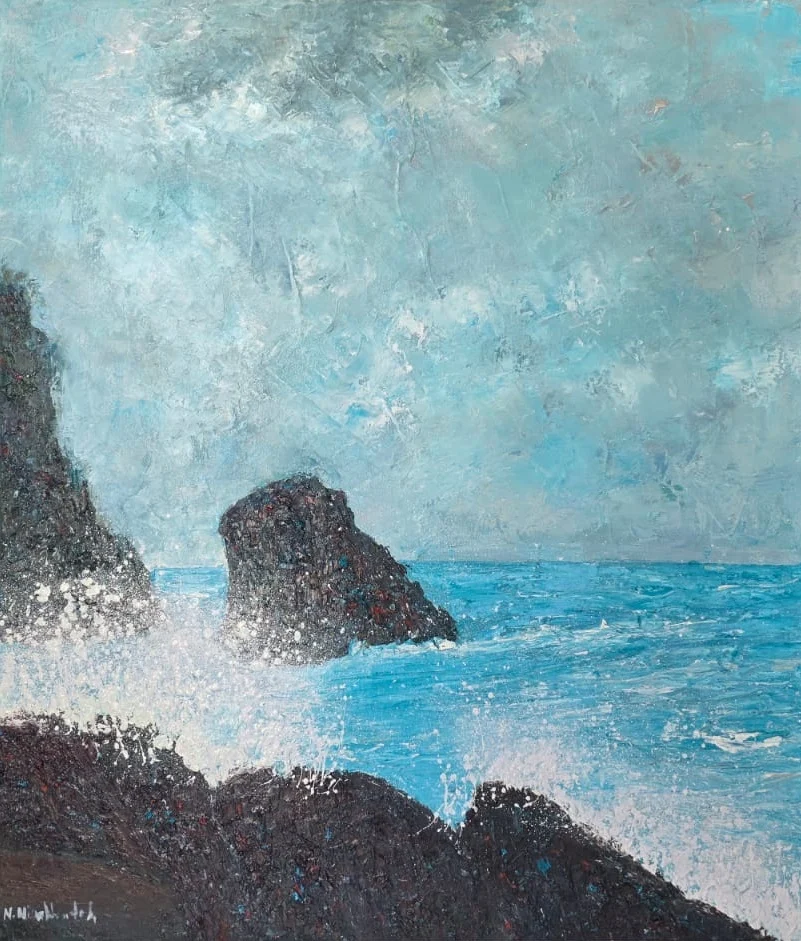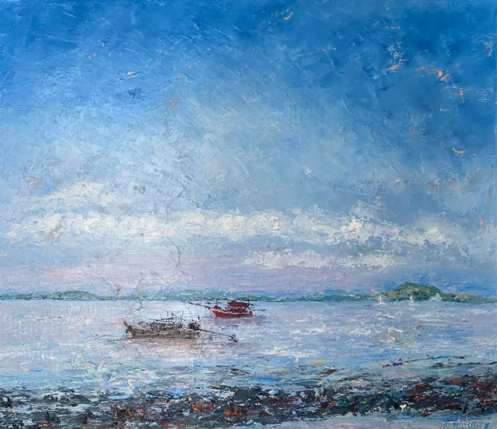 Her canvases are marked by layered brushstrokes and luminous tones that mirror the ever-changing tides, skies, and weather of Phuket. Through this process, she seeks a balance between memory, imagination, and reality—inviting viewers to feel not just what they see, but the deeper emotional connection that the sea evokes.