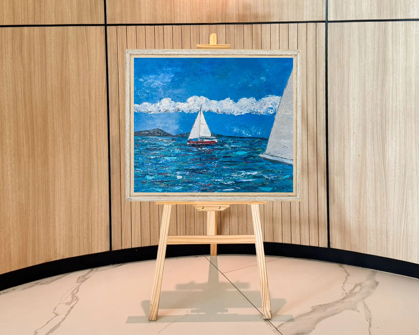 - Sailing at Yacht Haven (View of Phang Nga Bay) – A sweeping seascape that celebrates freedom on the water, framed by the limestone cliffs of Phang Nga Bay. This work captures the exhilaration of sailing and the grandeur of one of Thailand’s most iconic landscapes. (Oil on canvas | Size: 60 × 60 cm )