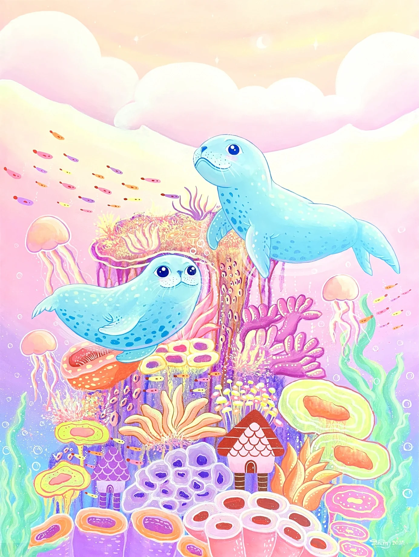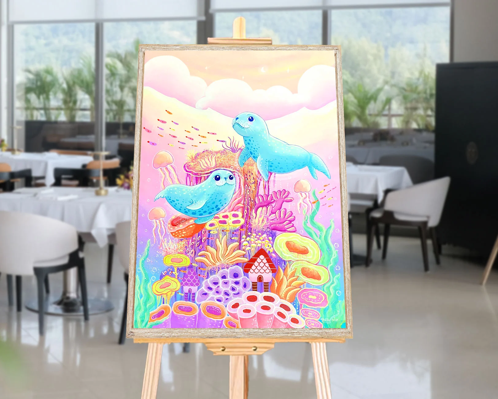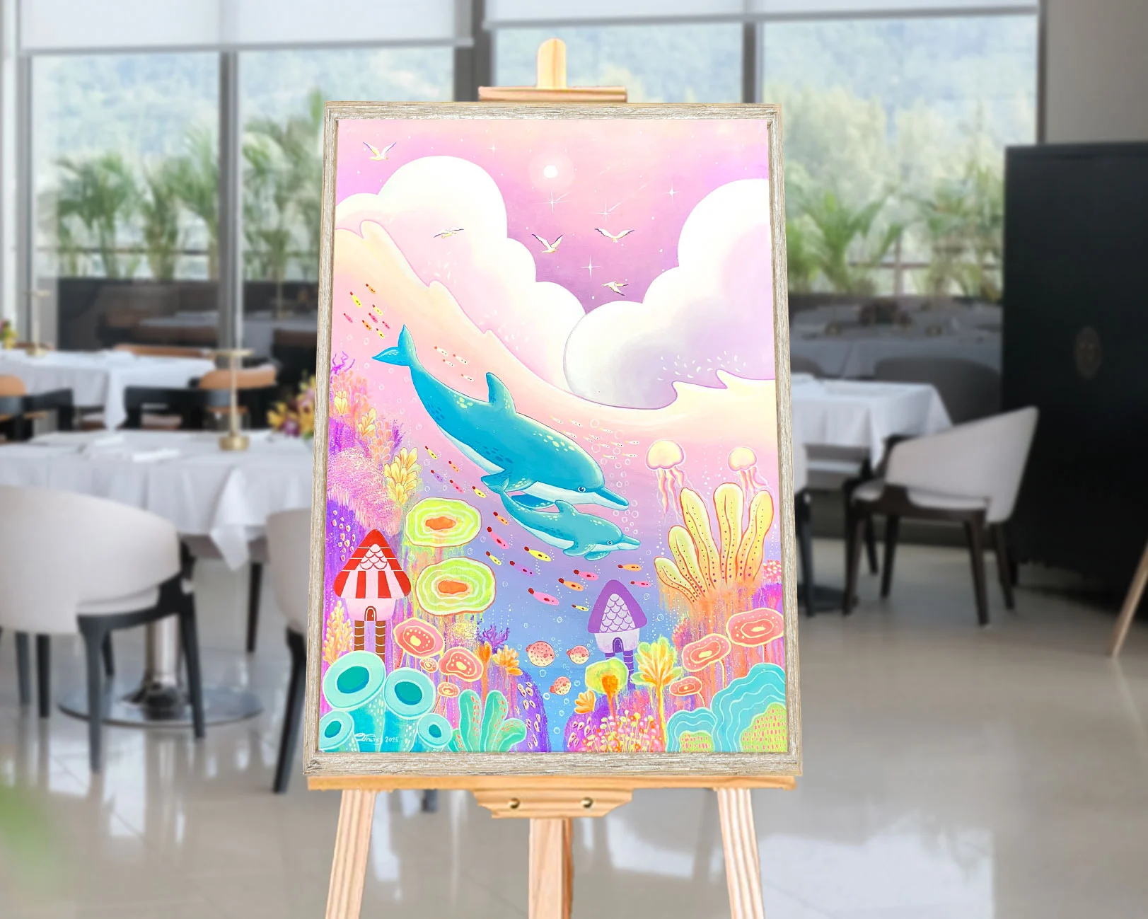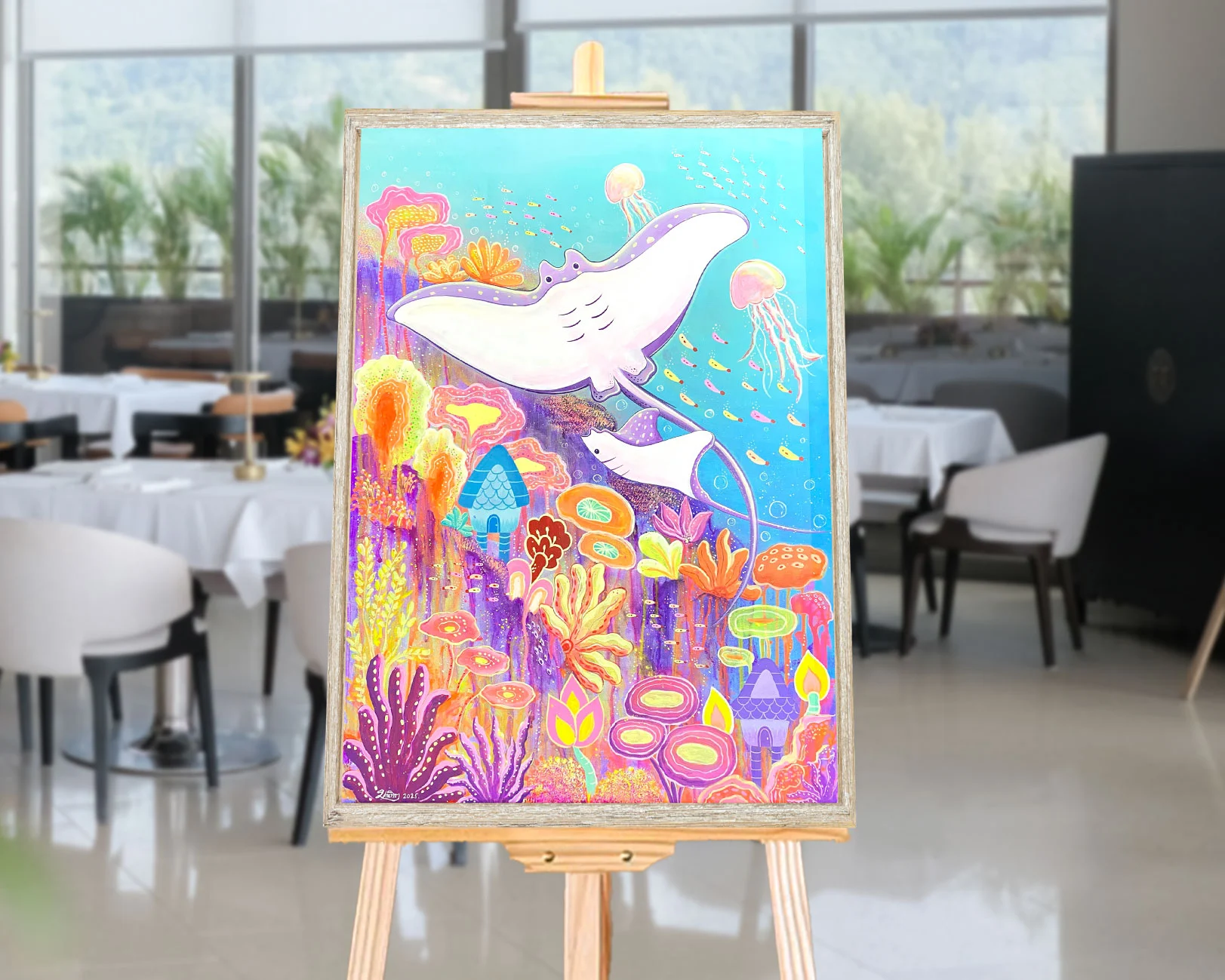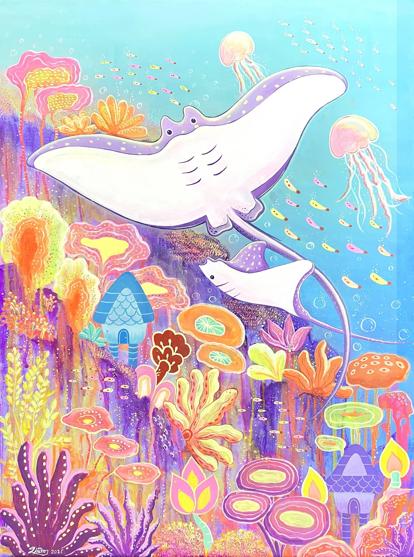 В ней Цвета моря В серии Монтира Хонтианг превращает океан в сказочный пейзаж с игривыми существами и яркими оттенками. Каждое полотно приглашает зрителей под волны, где встречаются воображение и сохранение природы. Через объектив поп-арта она изображает морскую жизнь в конфетных палитрах, напоминая нам о радости и хрупкости морских экосистем.