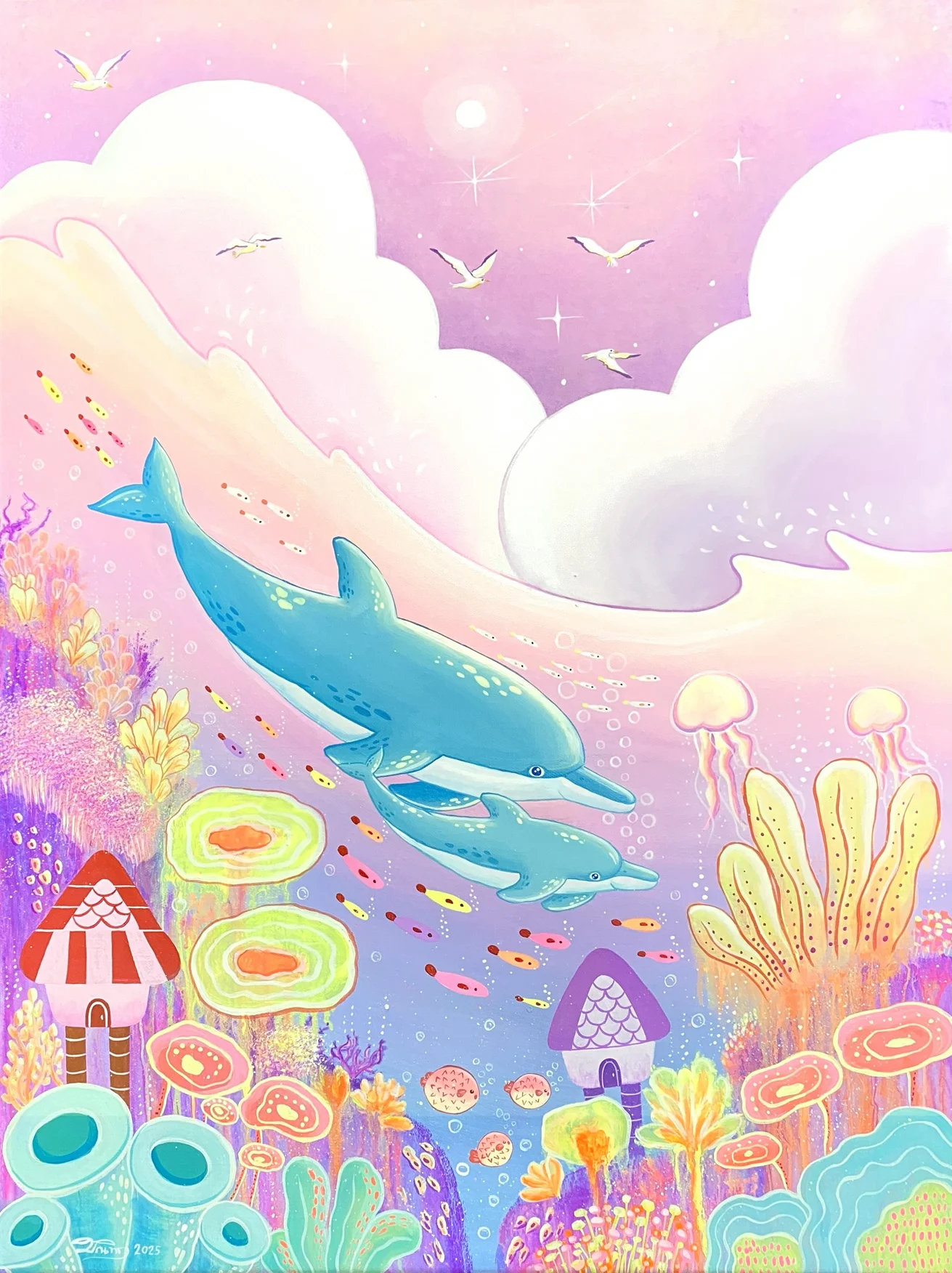 - Цвета моря №3 - Дельфины : Стая дельфинов проплывает через пастельный морской пейзаж, усеянный плавучими домиками и цветущими кораллами. Дельфины, издавна ассоциирующиеся с умом и гармонией, воплощают игривый оптимизм, который Монтхира пронизывает весь свой подводный мир.