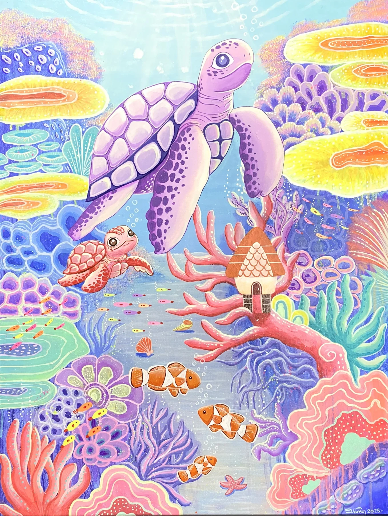 - Цвета моря №2 - Морские черепахи : Мать-черепаха и вылупившийся птенец путешествуют по причудливому коралловому царству в сопровождении рыб-клоунов. В тайских водах морские черепахи почитаются, но находятся под угрозой исчезновения. Работа отражает преемственность поколений, изображая океан одновременно как игровую площадку и убежище.